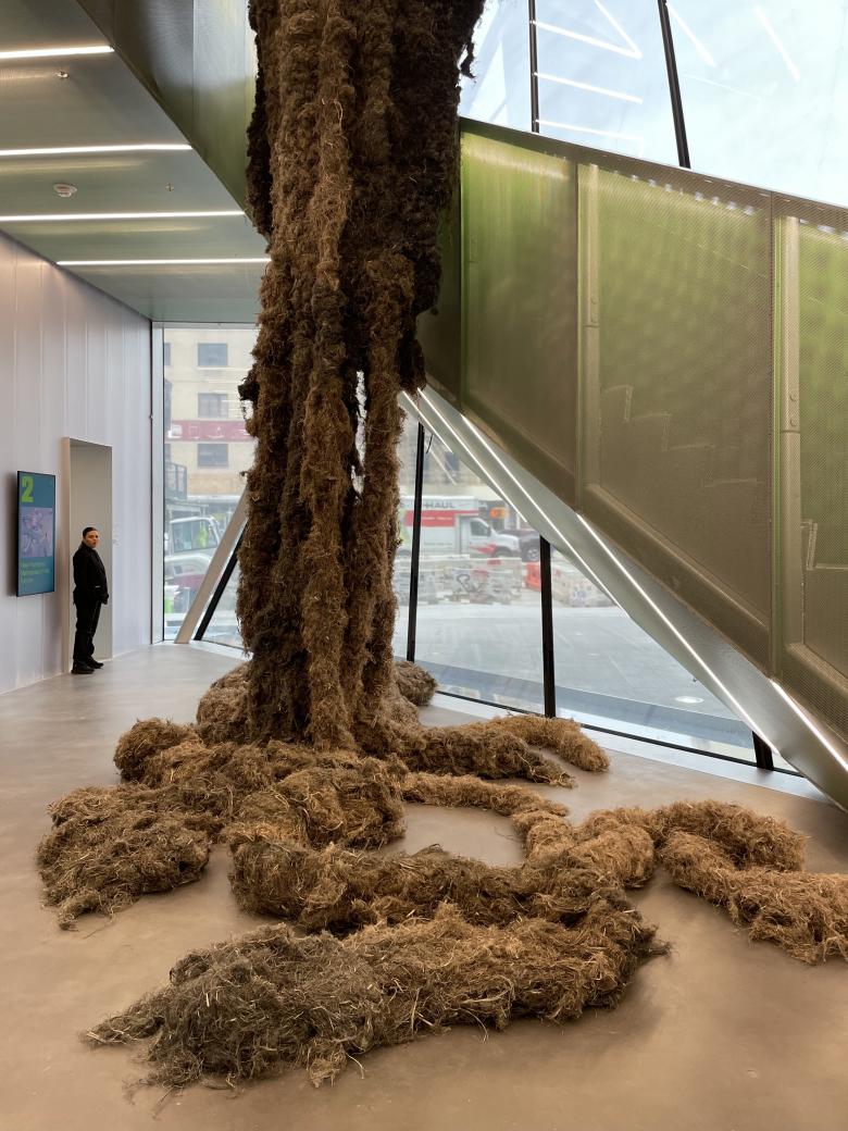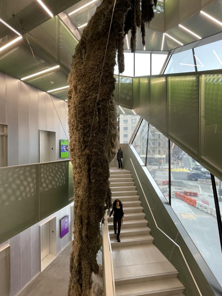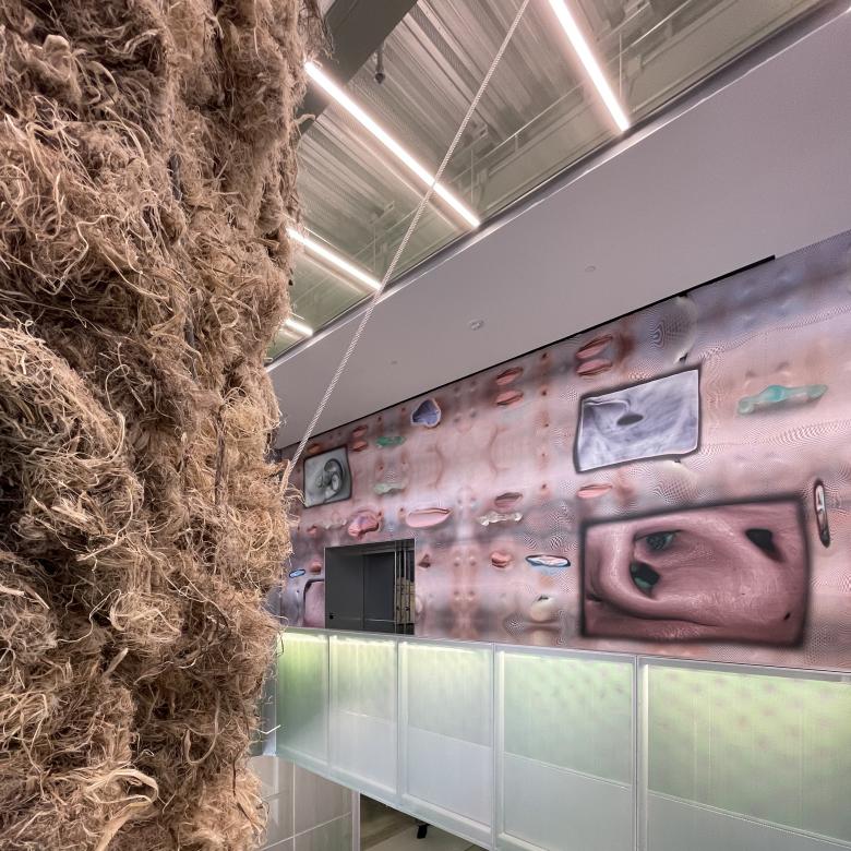 Here is a close-up of Shelter and a view of Tishan Hsu's ears-screen-skin (2025) on the second floor of the atrium. (Photo: John Hill/World-Architects)