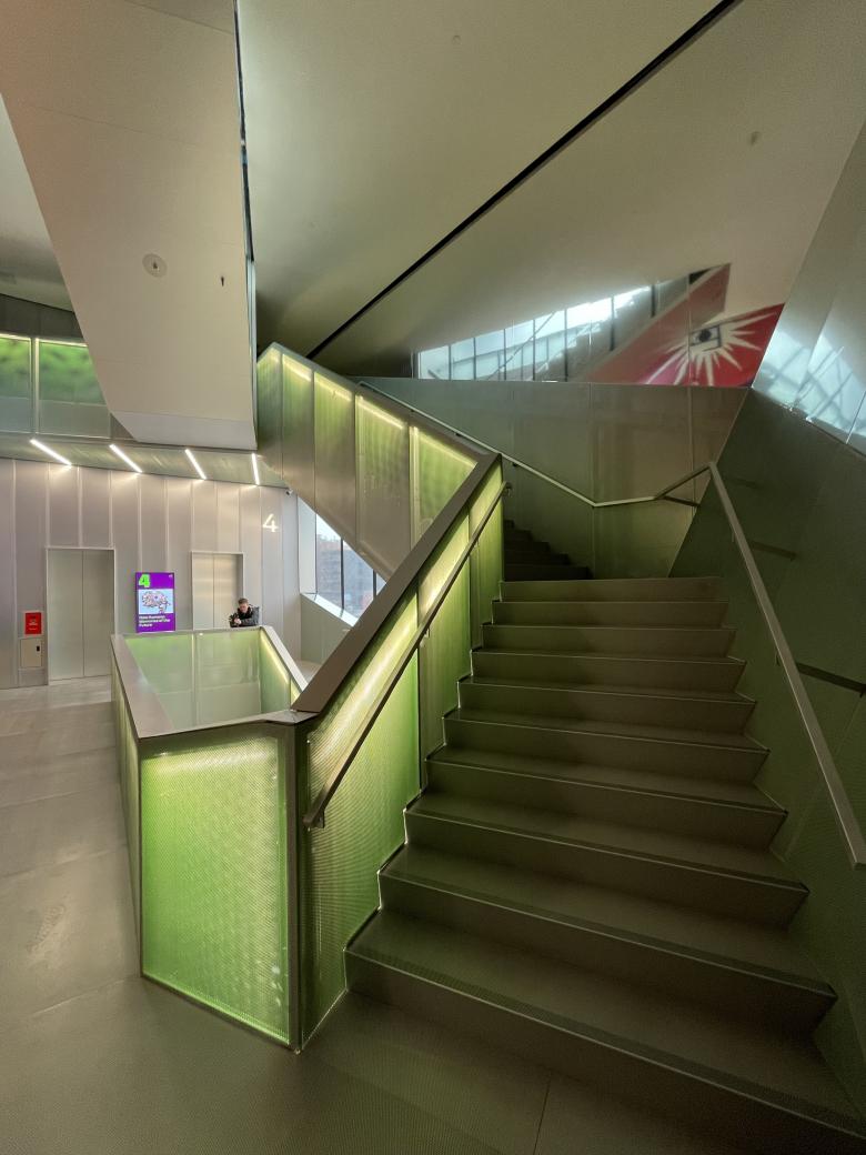 Although the artwork changes on each floor of the atrium, the architectural finishes are consistent, particularly the perforated metal guardrails with internal lighting that give the vertical space a green tinge. (Photo: John Hill/World-Architects)