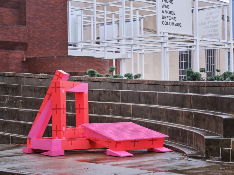 Outpost Office, the practice founded by architects and educators Ashley Bigham and Erik Herrmann, have installed Color Block No. 2 at various in-between spaces both outside and within the Wexner Center for the Arts, the building on the Ohio State University campus designed by Peter Eisenman and Richard Trott in the mid-1980s.