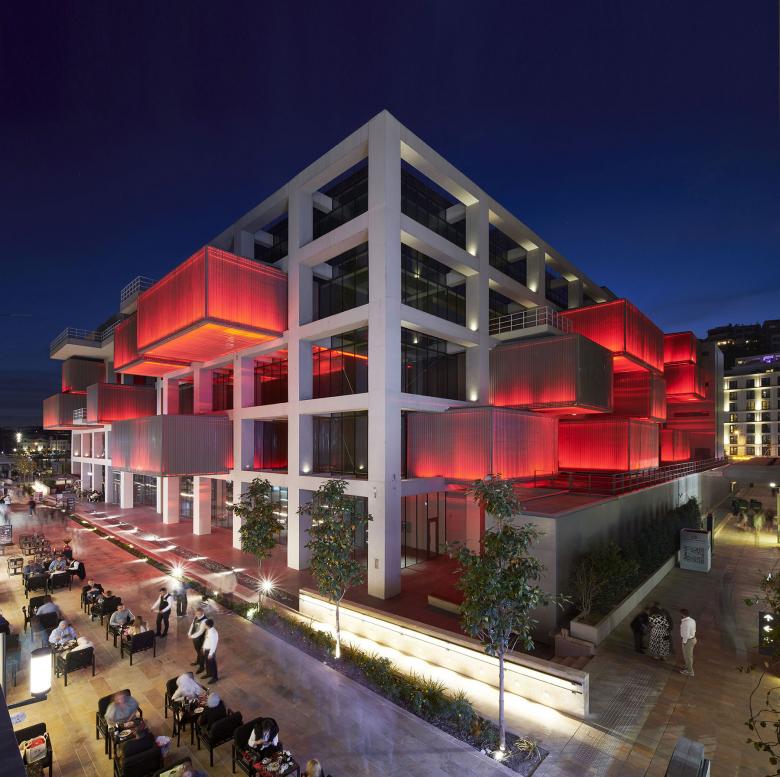 That system of projecting boxes that resemble shipping containers is most dramatic at night, when uplighting bathes the corrugated metal surfaces in red. (Photo © Thomas Mayer_Archive)