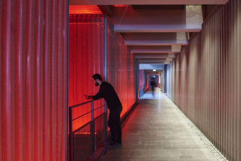 Seen up close, one can grasp that the corrugated surfaces are perforated, meaning the red light is visible through the openings when the ambient light levels are lower than the red light. (Photo © Thomas Mayer_Archive)