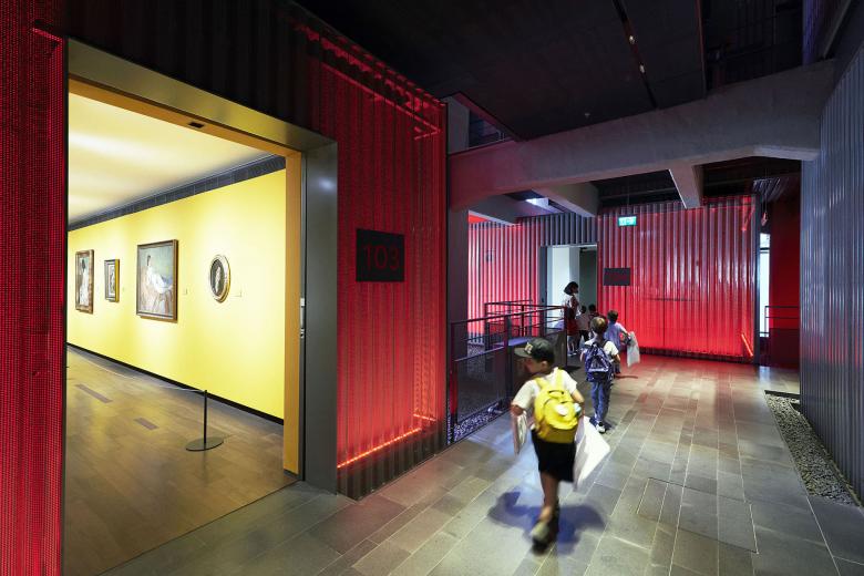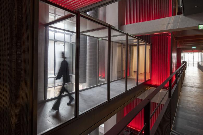 More than an external statement, the illuminated red surfaces extend inside the museum, even when it is bright outside. (Photo © Thomas Mayer_Archive)
