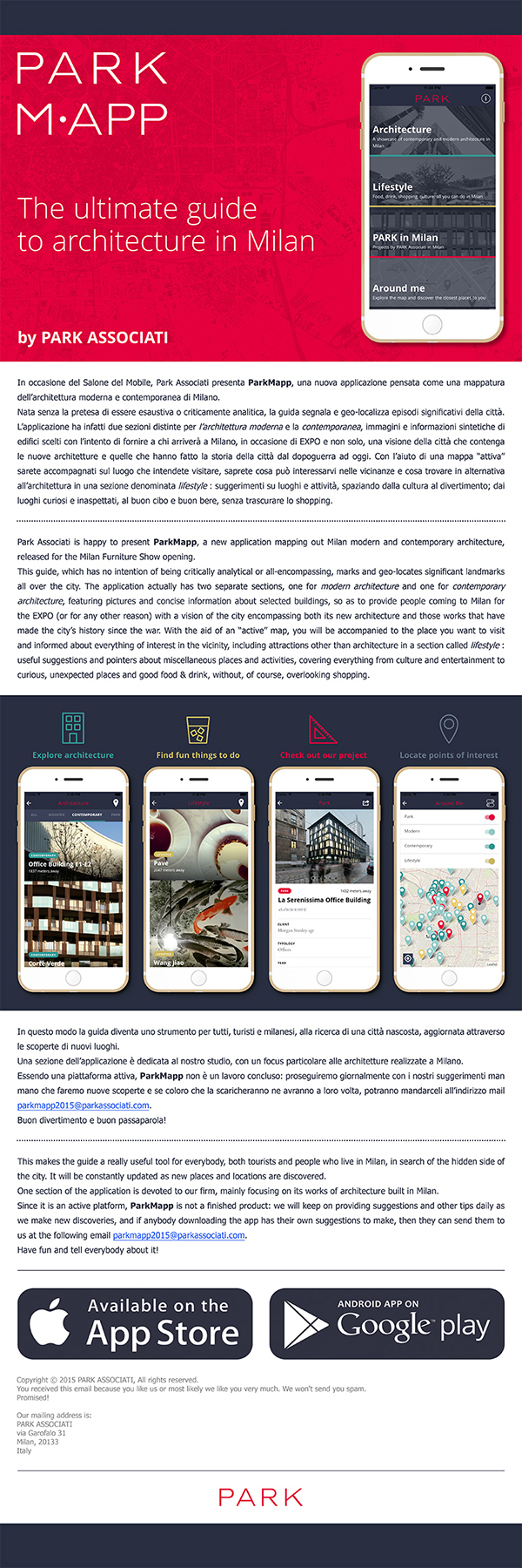 According to PARK Associati, "the guide explores a selection of iconic and unexpected pieces of architecture in town. Besides architecture and design, there are also suggestions on the most exciting locations for food, drinks, shops, cultural spaces and insiders' tips, offered in the ‘lifestyle’ section of the app." Additionally, the app highlights PARK's projects in Milan.