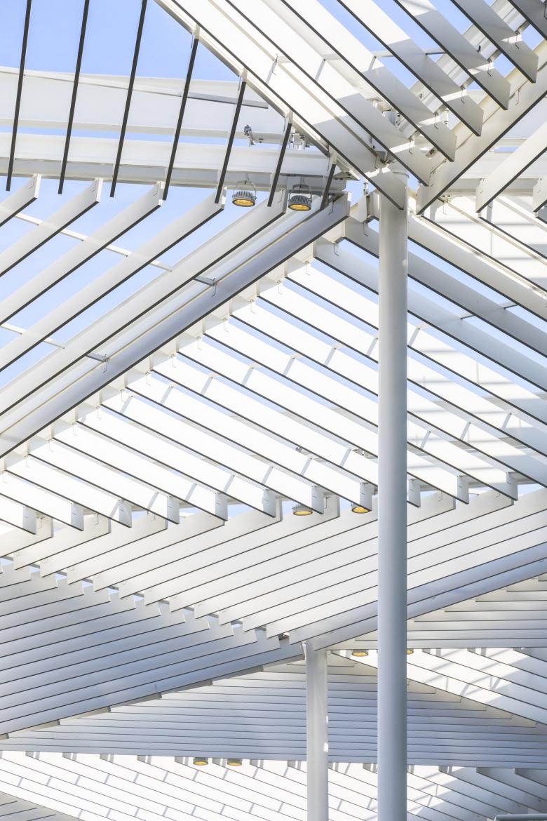 The folded roof visible outside continues over the atrium but combines opaque and transparent triangular sections to cut down on direct sunlight. (Photo © Sergio Grazia)