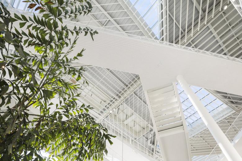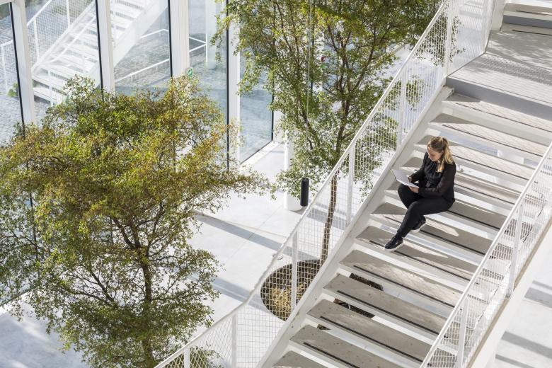 The trees and stairs on the outside of the building are repeated in the four-story, 1,000-m2 atrium that is the heart of the building. (Photo © Sergio Grazia)