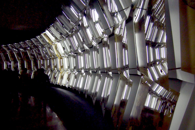 The 100 drawings mounted on glass comprise the main portion of the exhibit, found in the pavilion's curving gallery. From the entrance the drawings – made from hand with pen and sepia-toned wash mixed with coffee grounds – appear scalelike, though the ever-changing lighting behind the glass and the ambient music throughout give the installation a dynamic quality. From the other end of the curved gallery (photo below) the drawings and the reflective panels behind them appear prismatic, confusing as to which surface is which. Libeskind's drawings are meant to depict a "favela of the mind" or "metaphoric city of the future." Like his Golden Lion Prize-winning drawing from the 1985 Biennale, the Sonnets of Babylon is visually rich if esoteric; one need not understand his motives to appreciate the imagery.