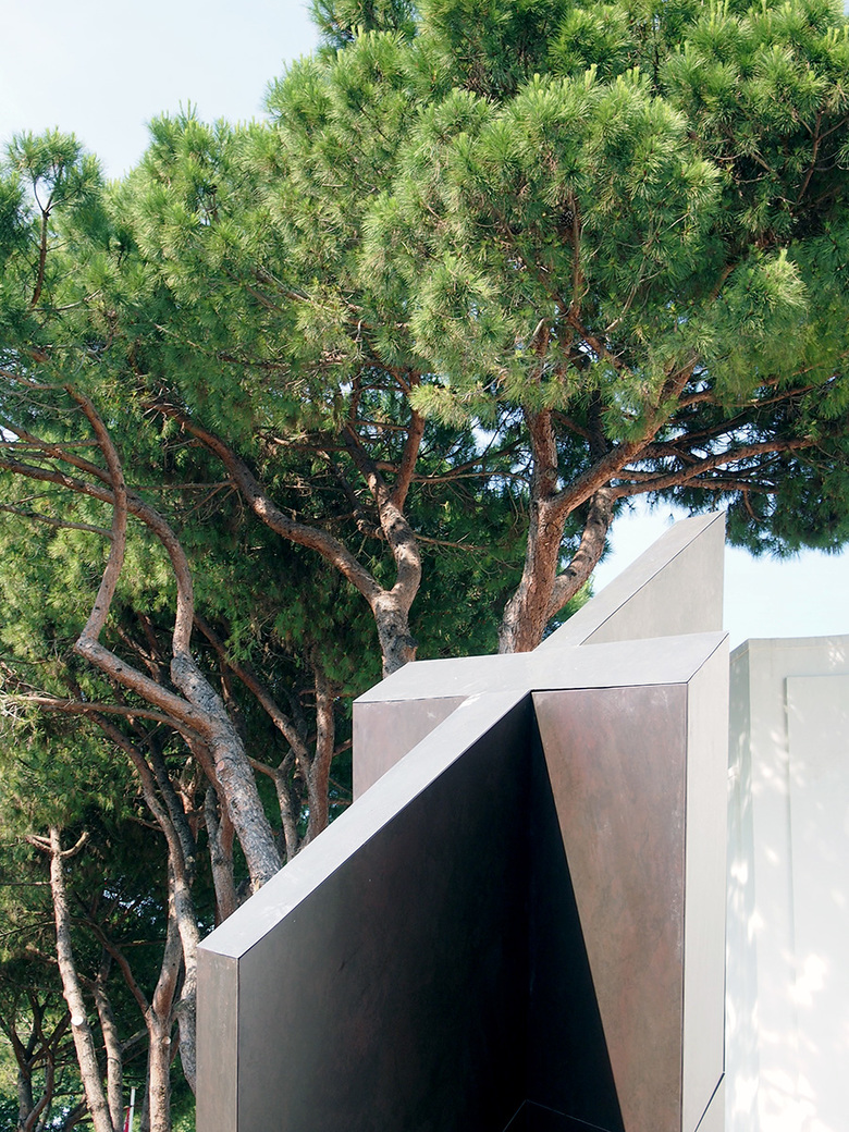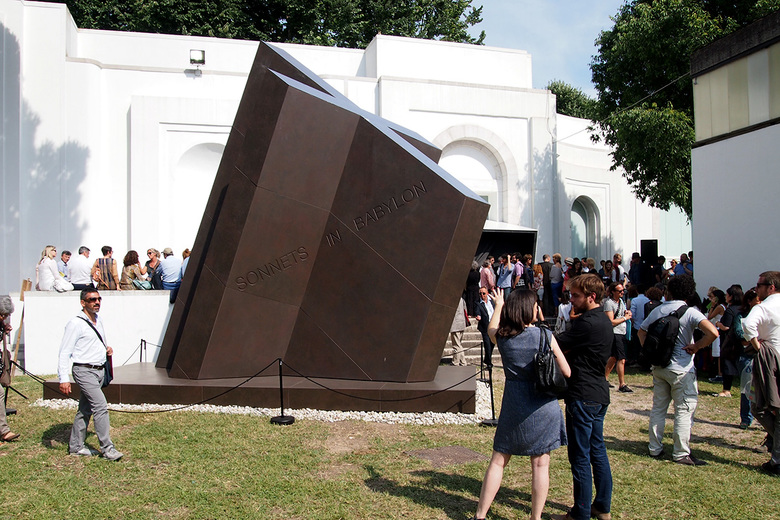 The exterior sculpture that goes by the same name as the interior installation is meant to serve as a starting point, "a virtual beginning of a line that runs through the Sonnets and anchors their exploding and collapsing worlds," per a statement. The angled top of the sculpture gives the sculpture a shifting quality that belies the static nature of grids. From certain vantage points (photo below) the sculpture appears Catholic, religious – fitting for the pavilion of the city of Venice.