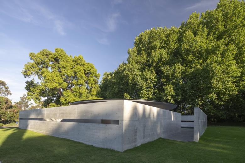 Ando's design is, for lack of a better phrase, unmistakably Ando. It is made of carefully executed reinforced concrete; it is geometrical, with a circular canopy sitting in the middle of walls that define two offset squares within the park; and it is peaceful and calm, with a reflecting pool comprising half of the plan. The 14.4-meter canopy, covered in aluminum, rests on a concrete drum. Horizontal openings in two of the 17-meter-long concrete walls frame views of the park and the Melbourne skyline. A continuous bench — also in concrete — beneath the opening on the “dry” side invites visitors to rest and take in the peaceful atmosphere or be comfortable during one of the many free events planned for the space. These events range from a quilt challenge and art installation made with ice cream to a puppetry performance — and those are just on the opening weekend!