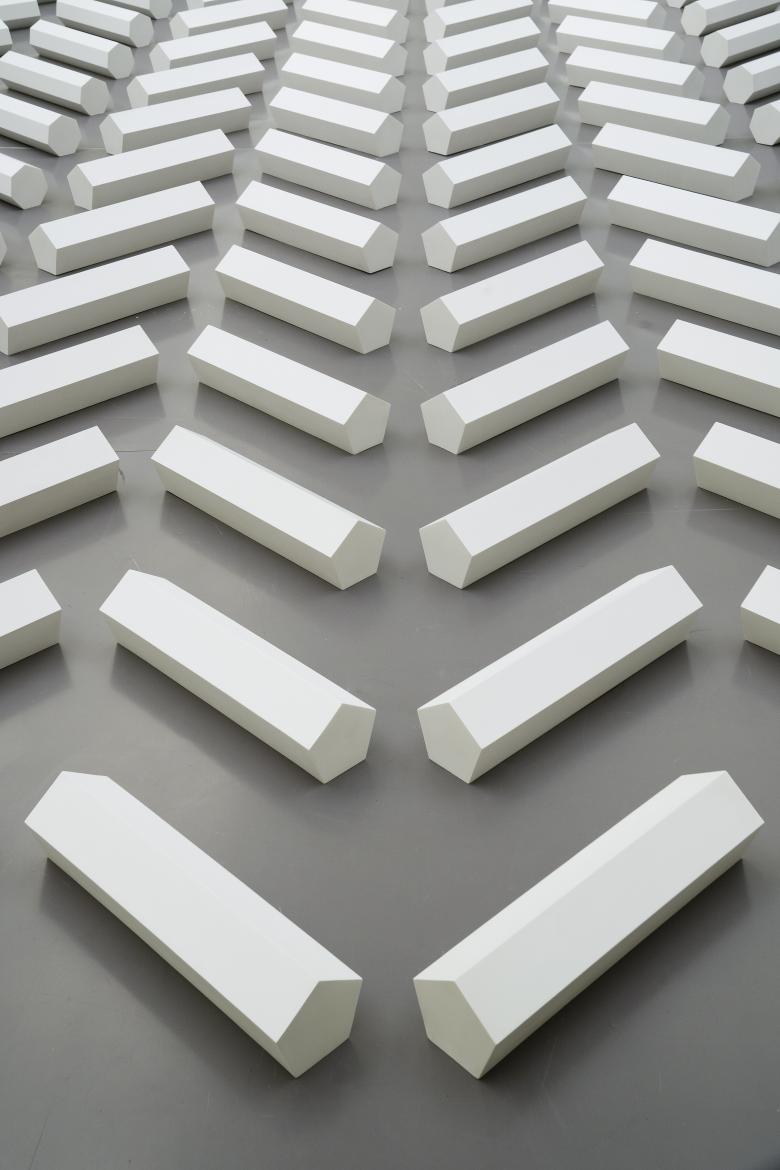 The rectilinear space, purportedly the largest column-free gallery in Switzerland at the time of the artwork's creation, allows for a sculpture of 500 square meters, with the 2,000 rods arranged in 20 rows of 100 each. Although an overall view, as in the above photograph, gives the impression that each rod is identical to the rest, there are three shapes: with five, seven and nine edges. According to a press release from the Kunsthaus Zürich, the arrangement of the rods (50 cm long and 18 cm high) "follows a specific rhythm: 5–7–9–7–5–5–7–9–7–5," which results in a "kind of herringbone pattern, with the rods seeming to move towards or away from the viewer, depending on where they are standing."