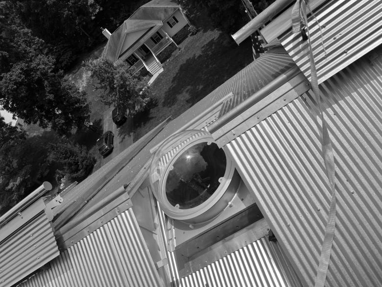 As we'll see, the skylight is one of the keys to the house's interior arrangement. Looking like the Astrodome of an old bomber plane, the skylight is one many custom pieces in the house fabricated by Pennell.