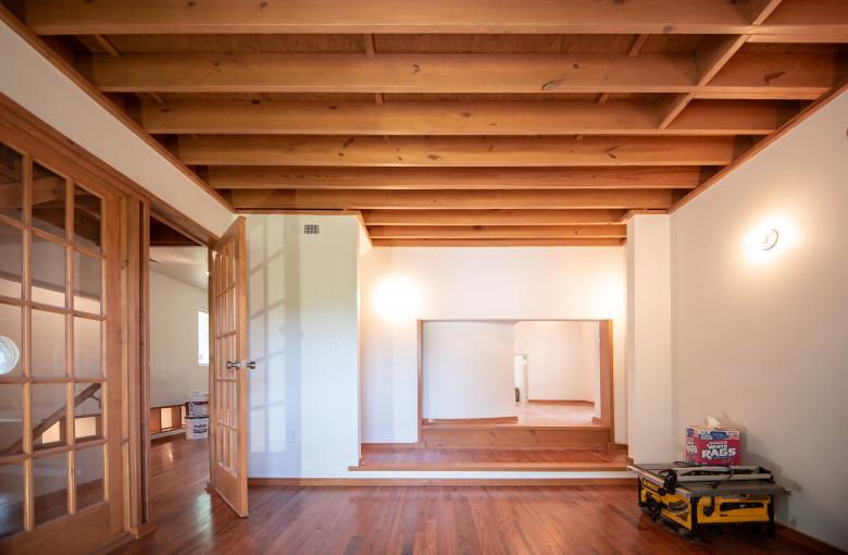 A photo of the master bedroom on the third floor, before the light well is opened up in the ceiling and floor.