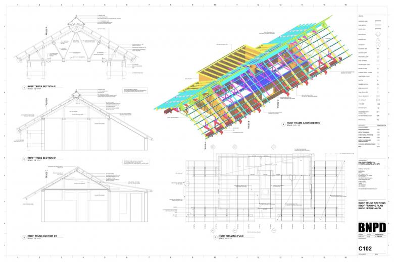 Drawings of the roof framing accentuate the complexity of the trusses, most of which are left exposed: steel outside, wood inside.