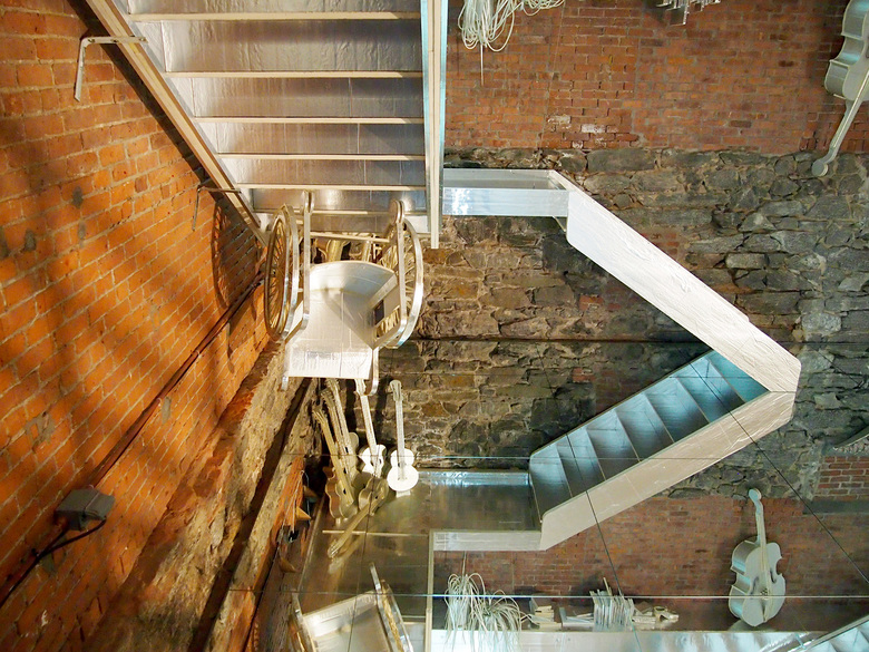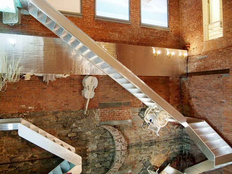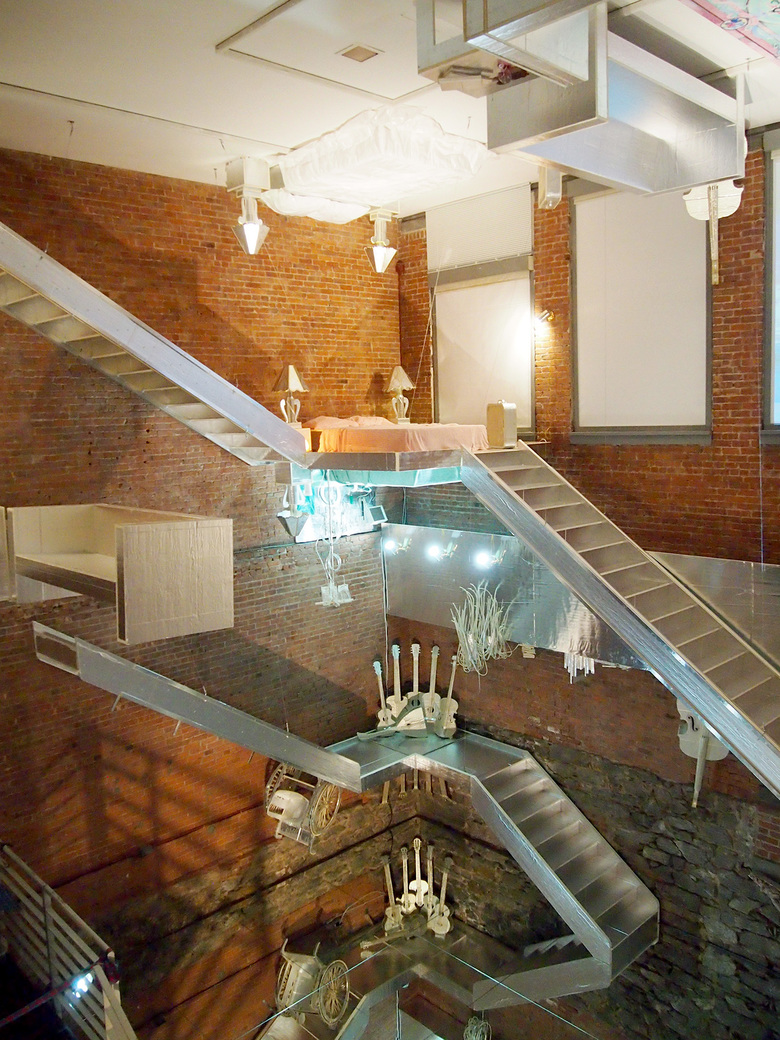 Inserted into the museum's duplex gallery space, The Flat Side of the Knife is Golden's largest installation to date, though the mirrored floor and ceiling make the construction look even larger. The stairs – made, like many of the objects, from rigid duct insulation with a metallic backing – combine with the mirrored surfaces to create a funhouse atmosphere akin to the mindboggling drawings of M.C. Escher. Objects mounted to the underside of the ceiling and the stairs, then reflected by the floor, confuse the eyes as to which way is up and which way is down.