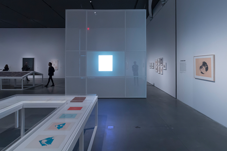 At the far end of the gallery is the only splash of color in the exhibition design by New Affiliates; a glowing blue-purple wall hints at something special out of sight.