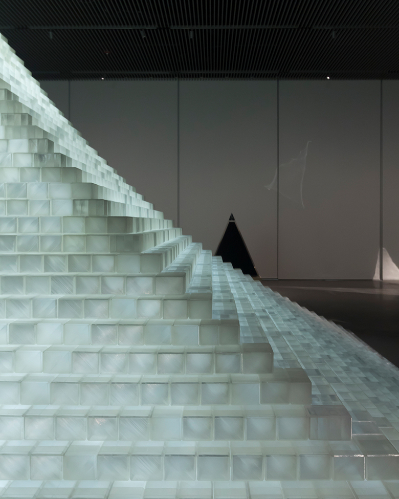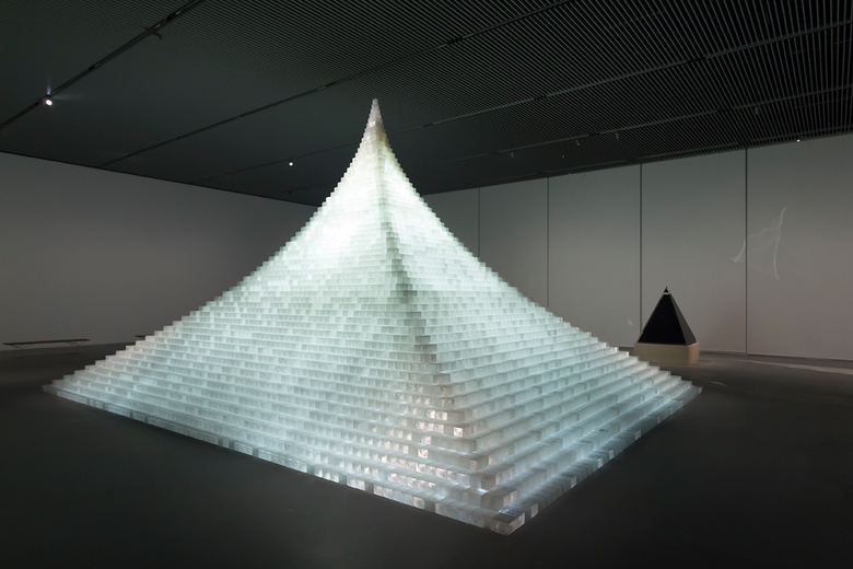 Model for Probability Pyramid—Study for Crystal Pyramid, illuminated from within, is made from nearly 6,000 corn-based, 3D-printed bricks, meaning the installation could be composted after the exhibition is done.