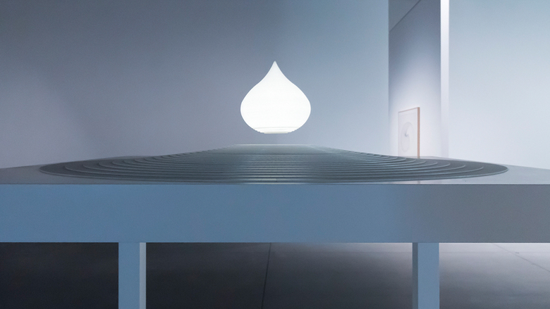 The artist's original Teardrop depicted a monumental teardrop-shaped sculpture "levitat[ing] above the center of the base afloat on an elastic cushion of magnetic flux." Impossible then and now, a scale version magically floats on a table top in the middle of the gallery.
