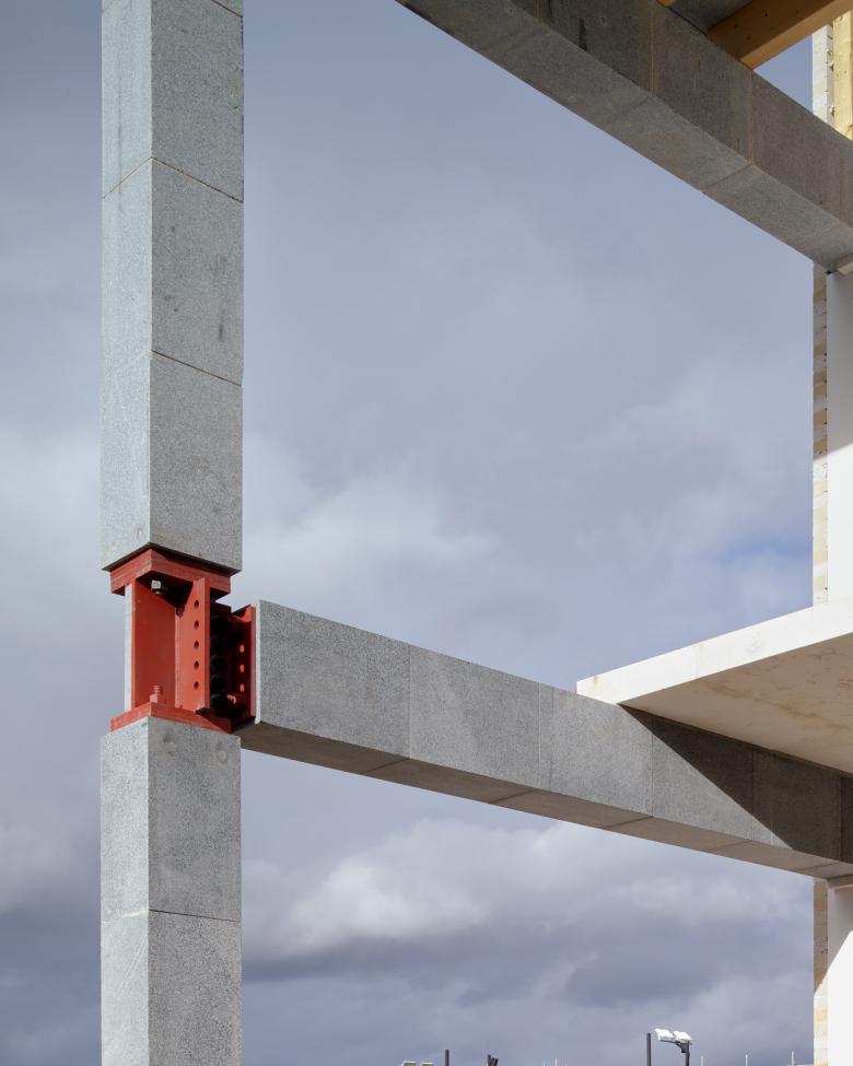 A highlight of With Every Fiber | Pigment, Stone, Glass, an exhibition World-Architects recently saw at Grace Farms, was Stone Space Frame, a sculptural pylon by Webb Yates created using post-tensioned stone. The space-frame structure was made of stone struts post-tensioned with steel bars welded to each other to create nodes. The whole reportedly used 75% less carbon than a comparable all-steel structure and thereby proposed an alternative structural solution to steel and concrete framing: stone.