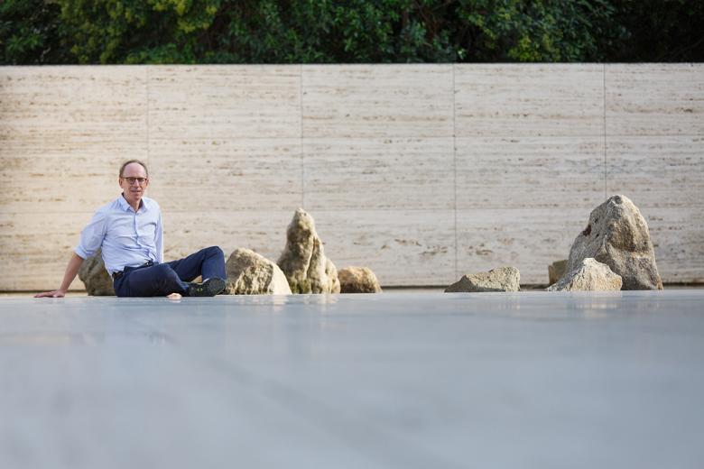 The Ryoan-ji Garden in Kyoto and the Mies van der Rohe Pavilion in Barcelona are two of my favorite places in the world. ... I find that when I am in either of these places my brain works in overdrive, trying to comprehend the space; at the Pavilion, the relationship between indoors and outdoors and the structure within the site and in Ryōan-ji with the stones in relationship with one another and with a larger metaphorical landscape. Both of these places are deeply human, they are about feeling oneself as a physical, living being in relationship to the world and also about a gargantuan achievement of profound abstract thought, almost like discovering a complex mathematical theorem. By dropping a version of Ryōan-ji into the reflecting pool of the Pavilion, by being able to see these two miracles of humanity next to each other, I am hoping that my brain will explode.