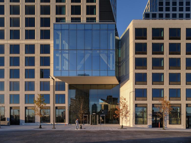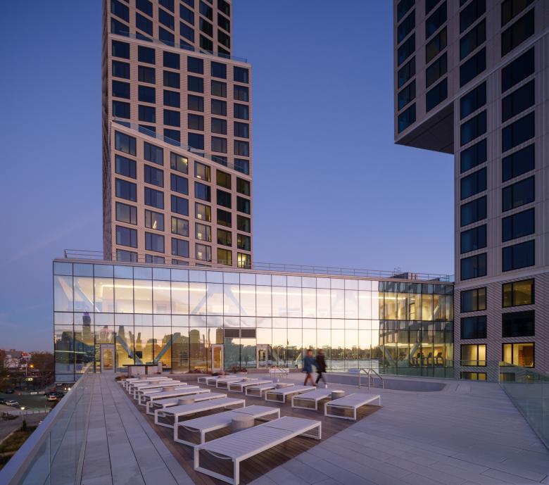 World-Architects got a tour of Eagle + West, the just-completed residential development on the waterfront of Greenpoint, Brooklyn, designed by OMA New York under partner Jason Long. The 745-unit residential project is most striking for the shifted and angled massing of its two towers — and the space in between them.