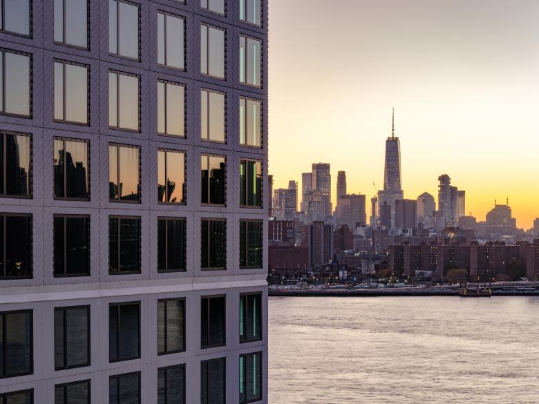 The shifting perception of the space between the towers is reminiscent of the Twin Towers at the World Trade Center, which were formally platonic and unbudging but looked different dependent on one's vantage point. Eagle + West, on the other hand, is enlivened by stepped and angled terraces and cantilevers that, as I learned about on the tour with Jason Long and others on the design and development team, allowed for greater separation between the towers and optimized views of Manhattan up and down the East River.
