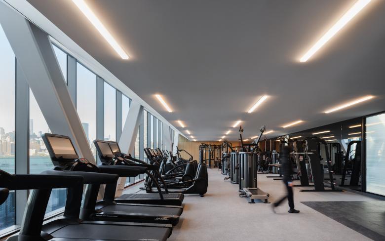 The wood-lined stair in the previous photo leads residents to the amenity spaces, including this generous second-story lounge at the southwest corner of the site, where views of the East River and Manhattan can be had. (Photo: Jason O'Rear)