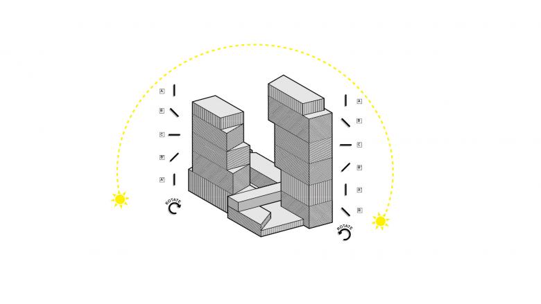 This diagram, seen from the northwest, illustrates the massing of the towers and the low-rise components snaking between them, but it also expresses the orientation of the serrated precast concrete panels that wrap the facades. (Image: OMA and Bloom)