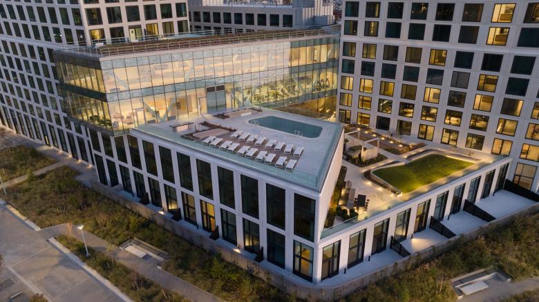 An aerial view better illustrates the indoor and outdoor amenities at the northwest corner of the site as well as the way the glassy bridge squeezes itself between the two towers. (Photo: Jason O'Rear)