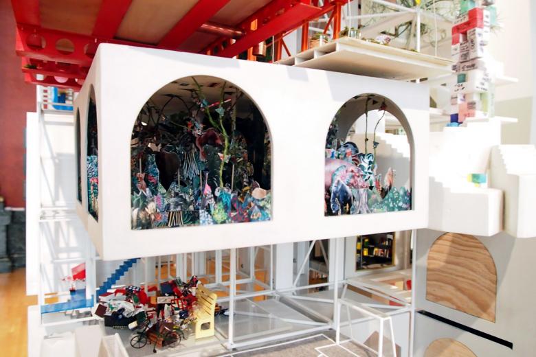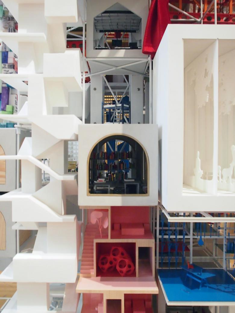 Although the program brief given the contributors to Vertical City points to an office building used by people, it's clear that the sixteen towers are architectural statements rather than practical solutions. (Those looking for the latter should head to Mana Contemporary for the pop-up exhibition, SOM: Engineering x [Art + Architecture], running at the same time as the Biennial.) Some of the designs in Yates Hall are explorations of materials, while others reframe histories outside of Chicago or grapple with the scale of tall buildings. For the first, MOS Architects' tower of custom interlocking cast-glass blocks is a standout. For the second, Christ & Gantenbein's tower inspired by a São Paulo garage exhibits the firm's search for essences (in this case frame and infill), but in this Chicago context it resembles too much the city's failed public housing and therefore falls flat. For the third, Tatiana Bilbao's complex "matrix of possibilities," as she calls it, is a captivating jumble and one of the few towers that invites more than a passing glance.