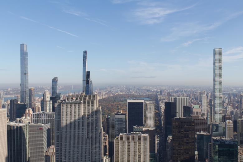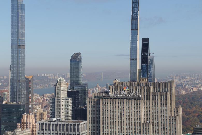 The view to the north is punctuated by the supertall residential towers along 57th Street (aka Billionaraires' Row) and extends to and beyond Central Park. In the foreground is the Comcast Building, familiarly known as 30 Rock, the tallest building at Rockefeller Center and home to the Top of the Rock observation deck.