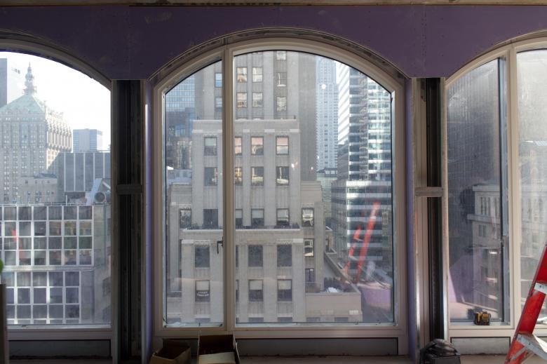 The impact of the arched windows is most pronounced inside, as in this office space on one of the lower floors. Note the operable window left of center: a novelty for modern office buildings in NYC, which tend to be sealed, it hints at the building being designed in the thick of Covid-19, when natural ventilation in office spaces was desirable.