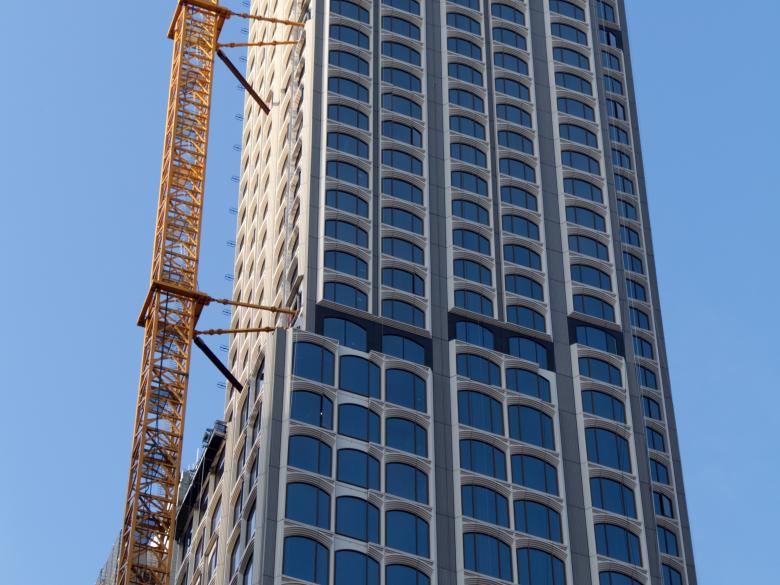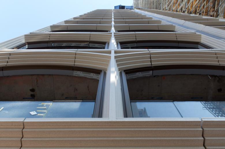 Terra cotta is used for the arched facade on the lower floors and enameled aluminum on the upper floors, though the finishing of the latter makes it hard to distinguish between the two materials.