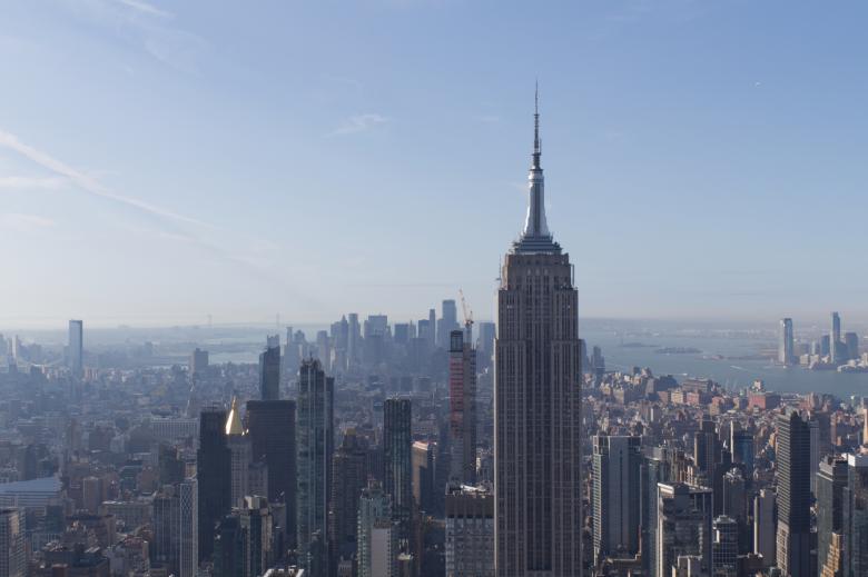 The view south, toward Lower Manhattan, Brooklyn, and the Statue of Liberty in the Bay, is punctuated by the iconic Empire State Building, which sits at Fifth Avenue and 34th Street, less than a half mile away.