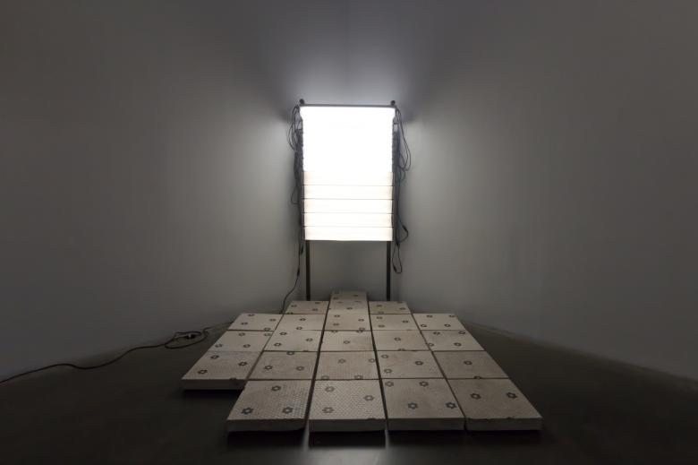 ...Bathroom Believer (2018) is an installation with porcelain tiles and rows of bulbs that taps into the religious overtones of A Heavenly Chord (2022): The tiles and lights express how Gates's mother used to pray in the bathroom, finding God present in an unlikely place.
