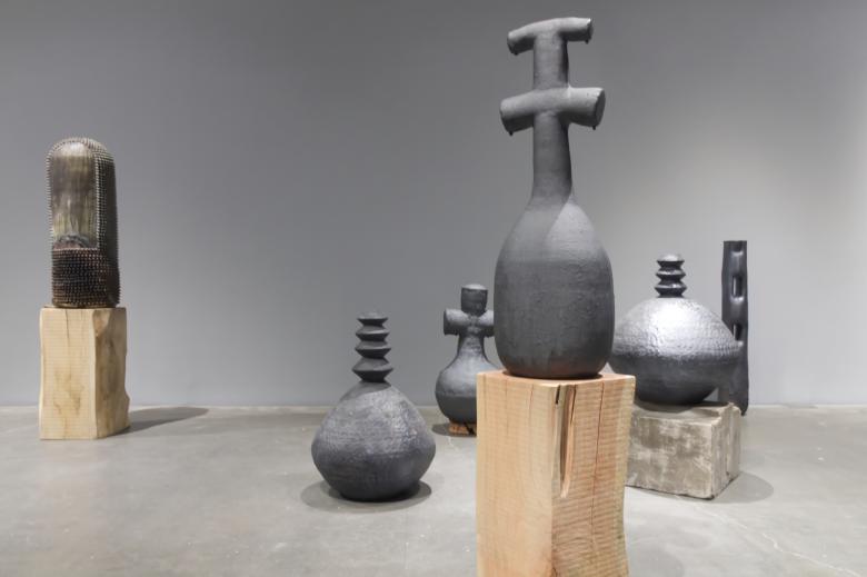 The third floor has a couple of small rooms with films documenting performances by Gates (singing with the Black Monks in one and making pottery in the other), but it is primarily one large open space with ceramic pieces made by Gates.
