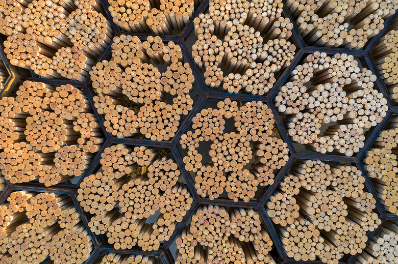 Xylem features a canopy of vertical logs above the seating areas, to create both shelter and a play of light and shadow. (Photo: Iwan Baan, courtesy of Tippet Rise/Iwan Baan)