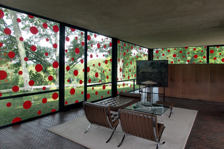 The name of the installation, Dots Obsession - Alive, Seeking for Eternal Hope - is simultaneously telling and enigmatic. Kusama's obsession with dots is readily apparent from one glance at her polka-dot attire, but the eternal hope of the title is not as immediately clear. The 87-year-old Kusama worked with Philip Johnson Glass House curator Irene Shum and the artist's studio on what she envisioned as a one-of-a-kind "Infinity Room." Unlike her mirrored "Infinity Rooms," which are devoid of context, Dots Obsession interacts with the Glass House from 1949 to change visitors' perceptions of it. In this sense, the application of the red dots makes Johnson's building come alive – a new reality (Kusama's) layered upon the old one (Johnson's).