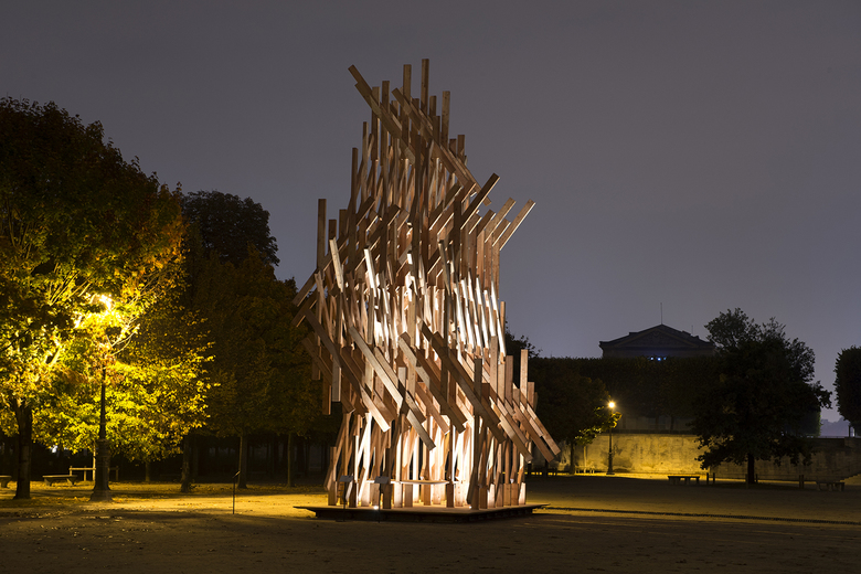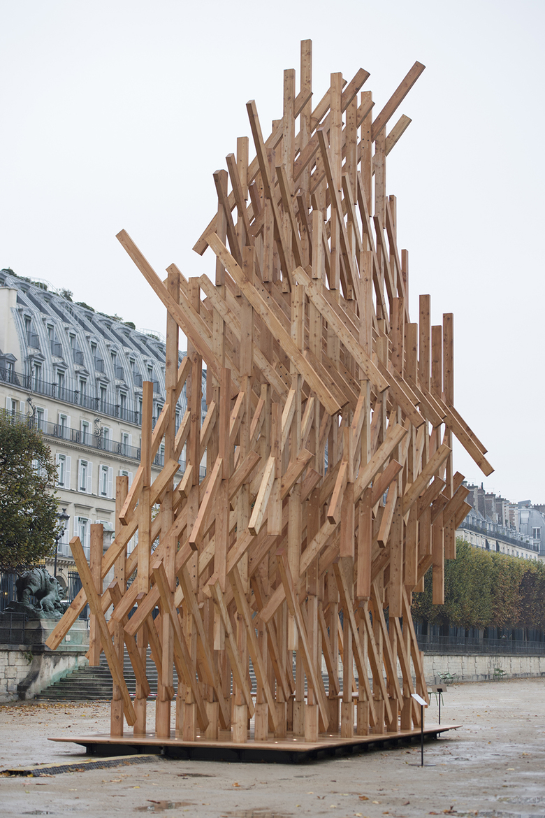 As part of the FIAC art fair taking place in Paris, Kengo Kuma has installed a wooden folly in the Jardin des Tuileries for Galerie Philippe Gravier. The name of the piece, Yure, translates to "slowly moving in the wind."