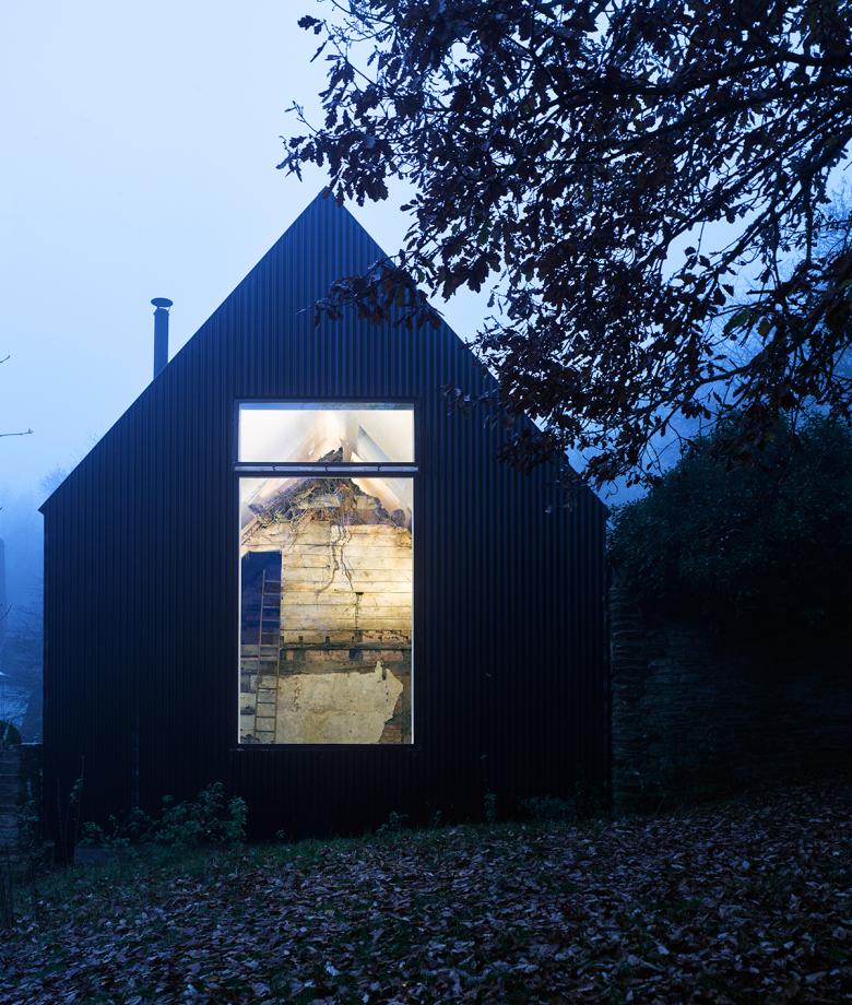 The strategy was not to renovate or repair the 300 year old listed building but to preserve it perfectly. The ruin is protected from the elements within a new high performance outer envelope. The new outer shell, which retains the shape of the existing cottage is clad in black corrugated iron, reflecting the common use of this material in Herefordshire for agricultural buildings.