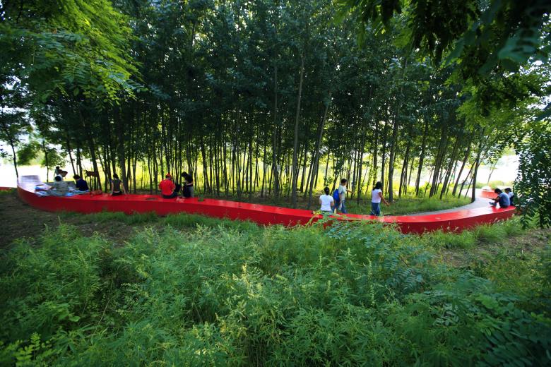 Similar approaches are found in other projects, something that makes Turenscape's landscapes distinctly theirs. Some of the most notable design features are found in the colorful pathways and pavilions that punctuate the green, blue, and brown landscapes. Although far from his first park, it seems wider attention first came to Yu with the aptly named Red Ribbon Park, located along the Tanghe River on the urban fringe of Qinhuangdao City in China's Hebei Province. Sponge-city landscapes span both sides of the river, but on the east side is a 500-meter-long “red ribbon” used for lighting, seating, environmental interpretation, and orientation.