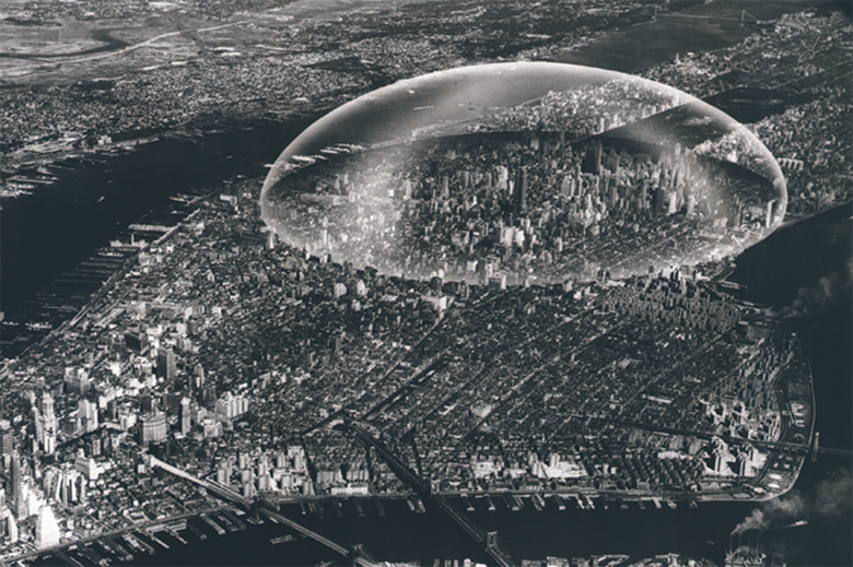 Buckminster Fuller, "Dome Over Manhattan" (1961), part of "Never Built New York" (Image via Queens Museum of Art)