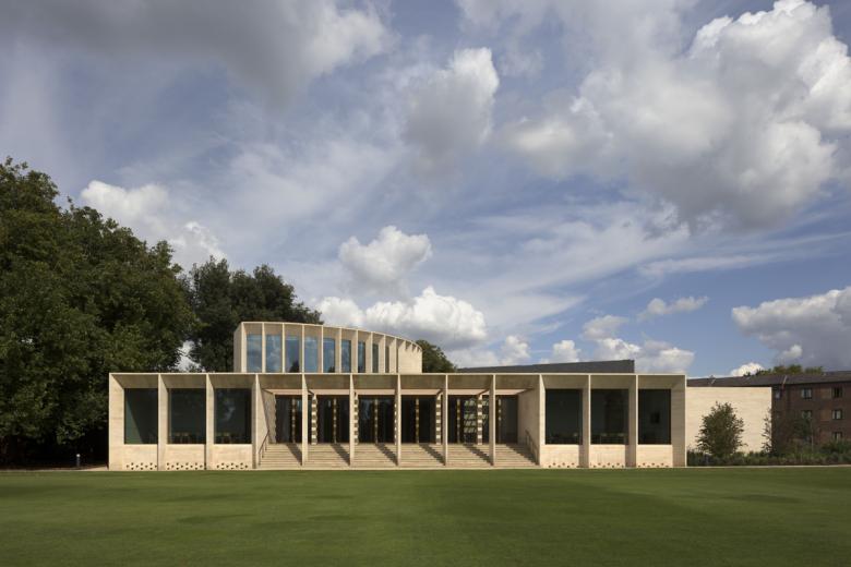 "The setting for this building is unbeatable. It is beside a perfectly-mown cricket pitch within the secluded, rambling and idyllic garden of one of Oxford’s most historic colleges. ... The building is classical in spirit, with crisp proscenia and a slender stone stoa marching along the cricket pitch façade. ... It is the natural materials, superbly honed, that ground the building and make it belong. It is the architectural design – the timeless pursuit of ordering space and light and form - that makes it a thing of pure joy."