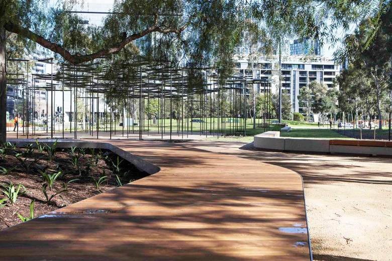 Amanda Levete's MPavilion, the temporary pavilion installed in Melbourne's Queen Victoria Gardens last year, finds a permanent home in the city's Docklands City Park, designed by MALA studio.