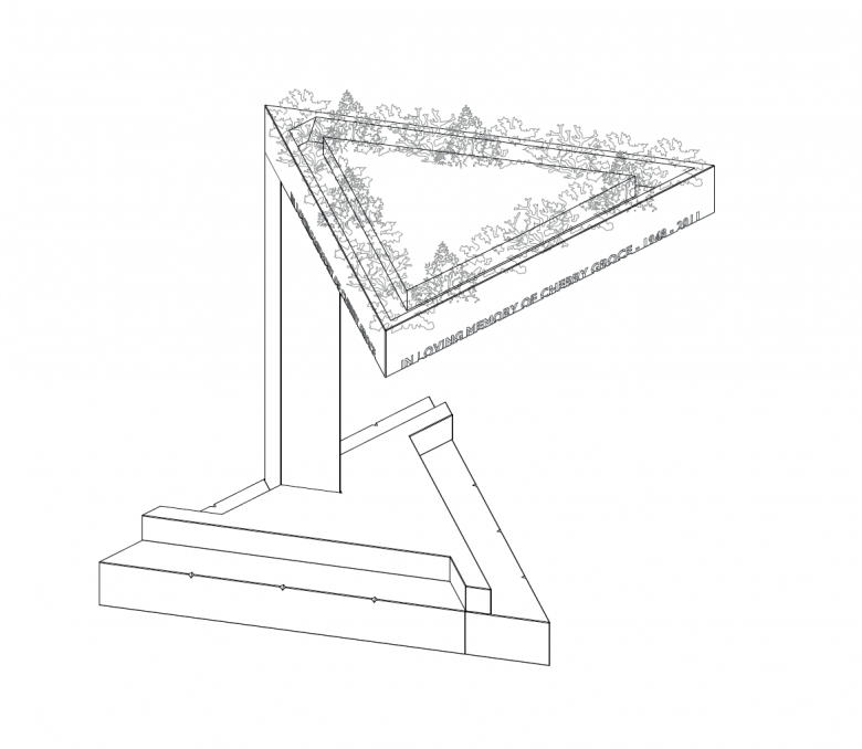 The Cherry Groce Foundation commissioned David Adjaye to design a memorial in honor of Groce, to be located in Windrush Square, which was redesigned by GROSS.MAX in 2008. The triangular shape of Adjaye's design responds to the angles of the square. According to a statement from Adjaye Associates, the memorial is "envisioned not only as a memorial but as a pavilion for the community" and therefore includes seating beneath a canopy. Symbolically, the single column is "representative of Cherry’s strength and support of her community," per the firm, while the roof "speaks to the protection and shelter of the Brixton community ... its planting serv[ing] as a reminder of change, growth and optimism."