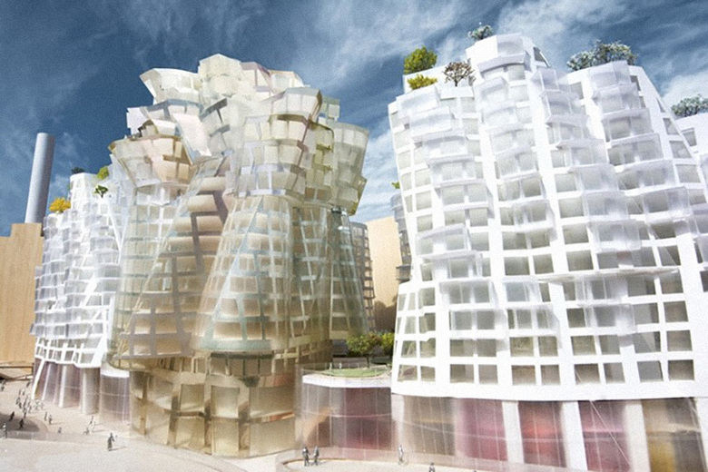 Last fall the Battersea Power Station Development Company selected Norman Foster and Frank Gehry for the phase 3 redevelopment of the impressive Battersea Power Station in London. Last week their designs for mixed-use buildings straddling the new high street (to be called Electric Boulevard) were unveiled to the public. The projects will become the gateway to the larger development and will consist of 1,300 dwellings, 160 hotel rooms, and 350,000-sf of retail space.