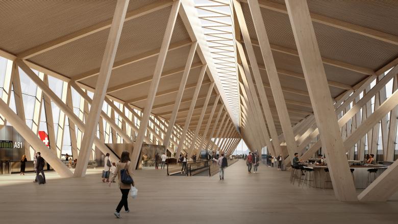 In a press release, BIG founder Bjarke Ingels described contemporary airports as "Frankensteins of interconnected elements, patches and extensions." In turn, the firm's design takes "the simplest possible response: a mass timber space frame that is structural design, spatial experience, architectural finish, and organizational principle in one." Topped by solar panels, the terminal made from locally sourced timber is an attempt "to meet the complex global challenge of Co2 reduction."