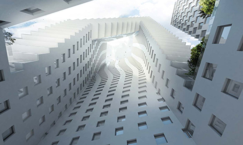 Looking up at the twisting towers (Image: BIG, via New York YIMBY)