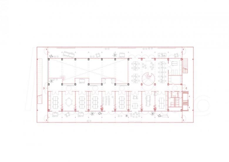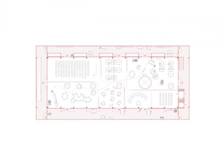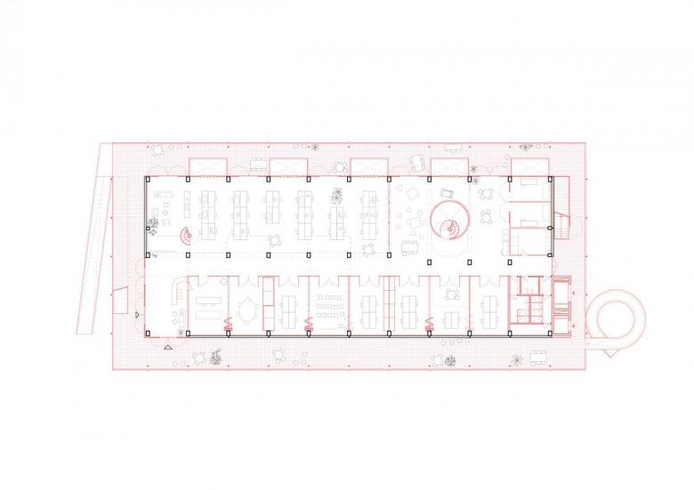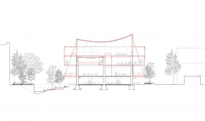 The open first floor and the free upper floor break up the form; the new perimeter area set in front of the existing facade will not be heated as a buffer zone, but it can be used. An element that could already be seen in the winning competition entry for the embassy residence building in Tel Aviv can also be found here: the plan is to create a climatic intermediate zone for additional uses with a suspended metal facade. Düsing described this transfer in a recent interview: “Topics that we could only touch on in the previous project are developed in greater detail in the next design, newly applied, and possibly also addressed in the next project.” In Siegen, the shell structure of the building is retained, while facade elements that are no longer required are given a new function as seating.