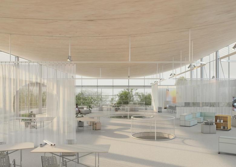 The top floor beneath the suspended timber roof (Visualization: FAKT+Gustav Düsing)