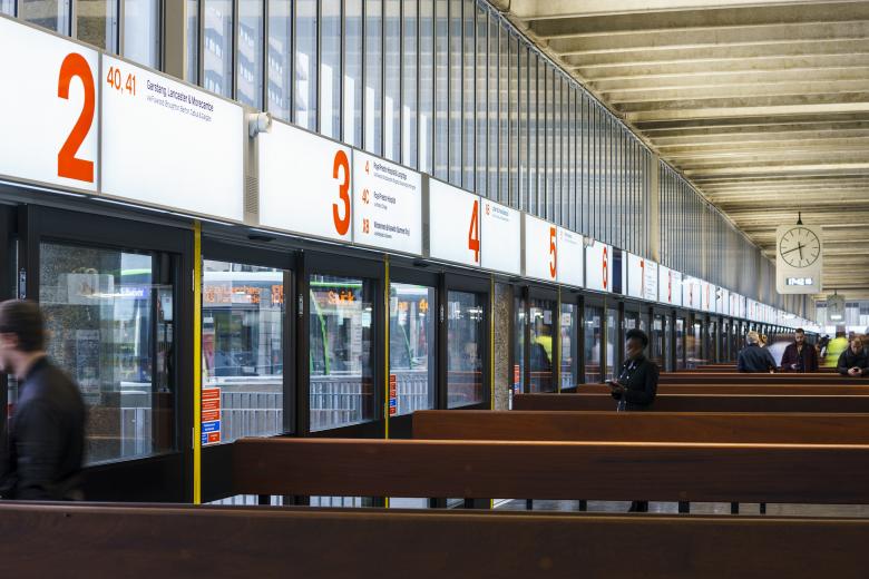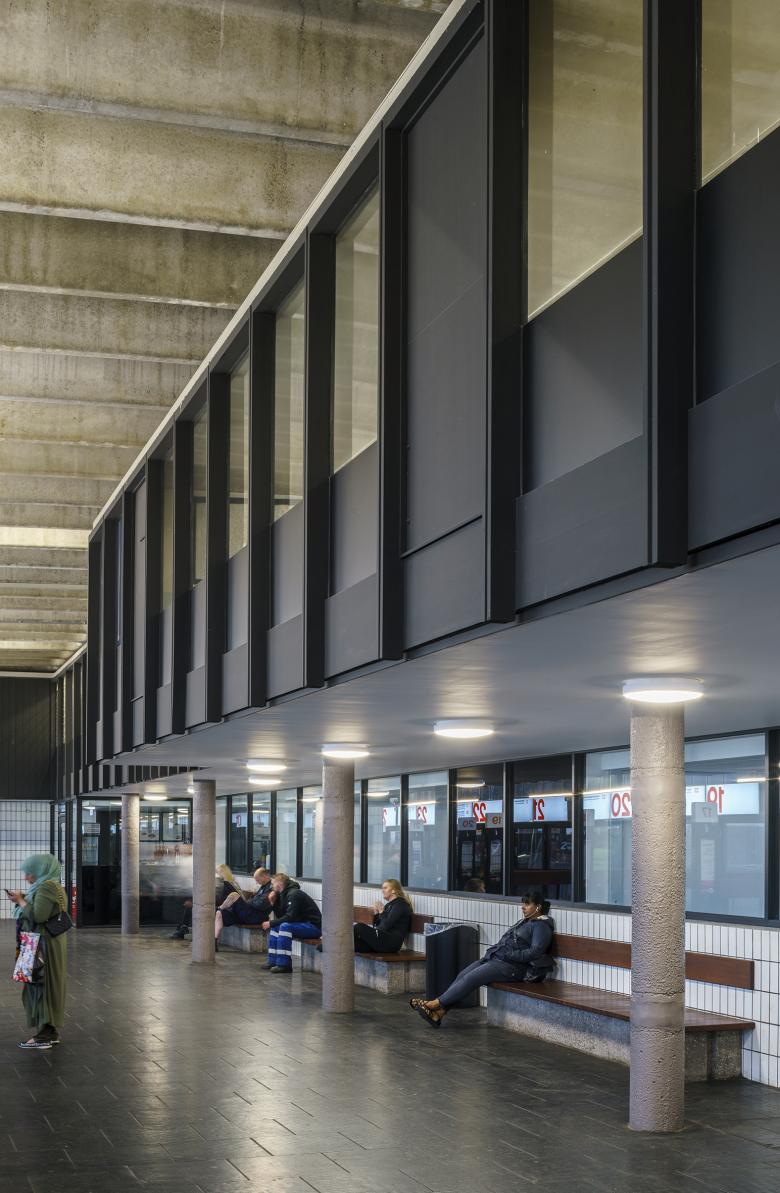 Fast forward to 2012, and the sizable bus station was included in the World Monuments Watch alongside two other brutalist buildings in the UK: London’s Southbank Centre (1976) and Birmingham Central Library (1974), the latter of which was demolished in 2016. A design competition in 2015 led Lancashire County Council, the owner of Preston Bust Station, to appoint John Puttick Associates to restore the station. According to the architect's website, "the brief included integrating the building with the city, addressing unsafe pedestrian access, creating a dedicated Coach Station and brightening the interior." The firm responded with a design that reoriented the building, "prioritizing pedestrians over vehicles," with spaces consolidated and rearranged, such that the waiting area, for instance, now faces the public square. The jury* commended the urban moves but also the details: "The thoughtful detail of the project at multiple scales particularly resonated with the jury," per the announcement, "including the attention to the restoration of the original flooring and the enhancement of the exterior space to prioritize pedestrian circulation."