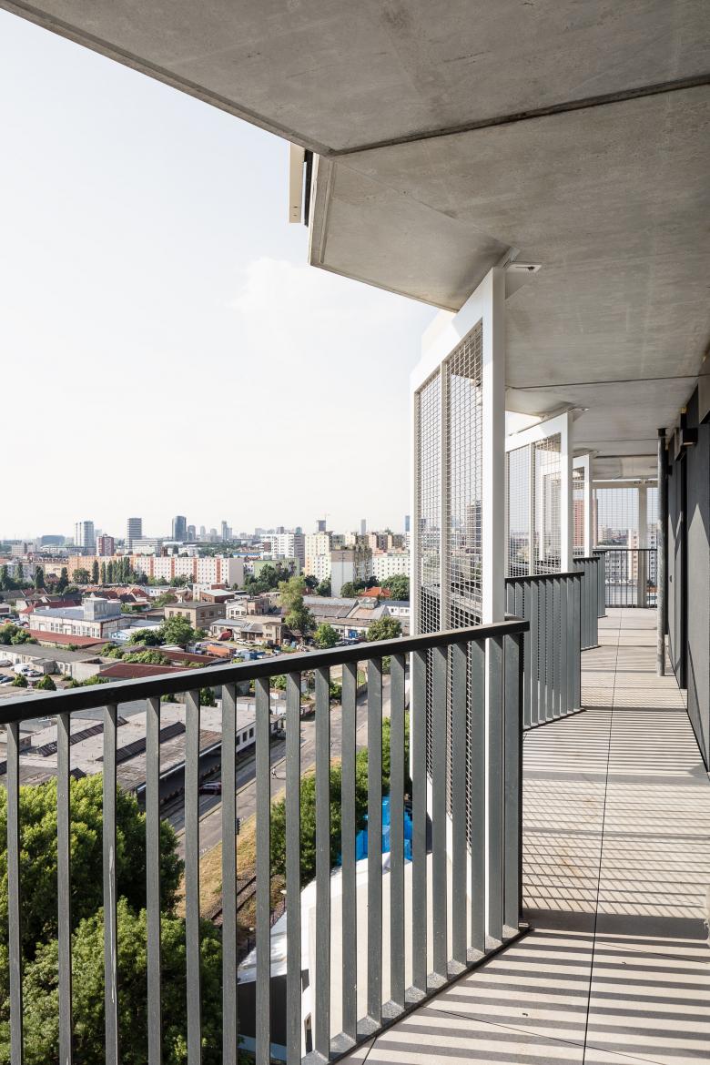The double-height lobbies have odd “representative” interior designs with colorful palm trees printed as patterns onto the walls. The facades show rectangular loggias all around; their layering shades and protects the outdoor sitting spots from wind and rain. The garden on top of the building is for collective use. It was designed by the landscape architecture office MAN MADE LAND from Berlin. Transsolar, also from Germany, was responsible for climate engineering and building technology. The client for the Račianska towers was Slovakian developer CORWIN. Together, they added an Austrian touch to the skyline of Bratislava.